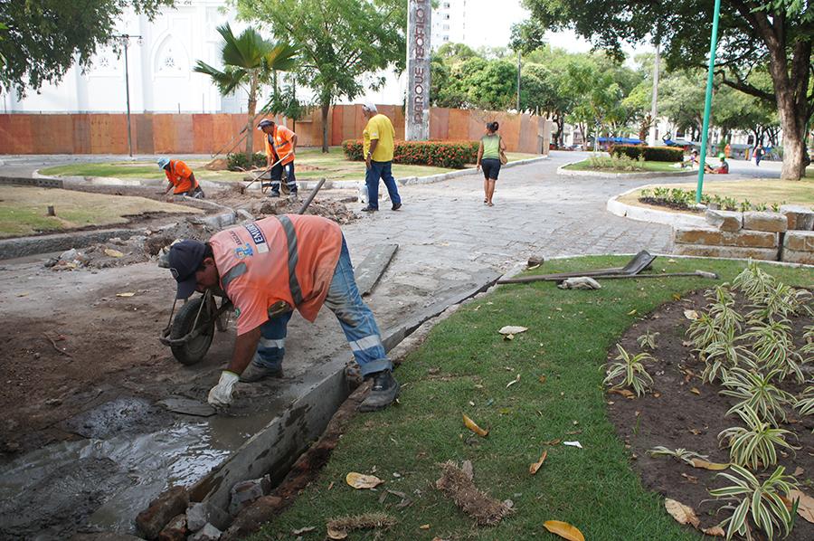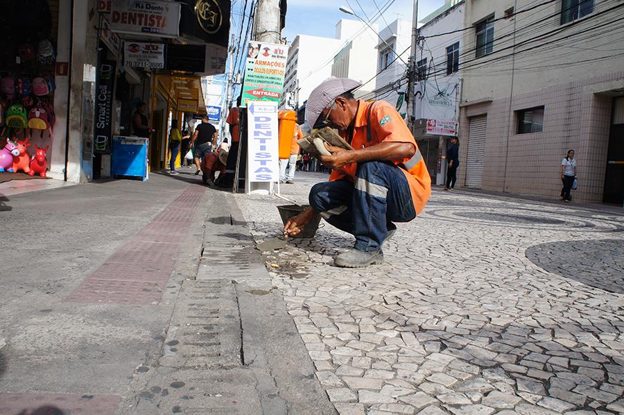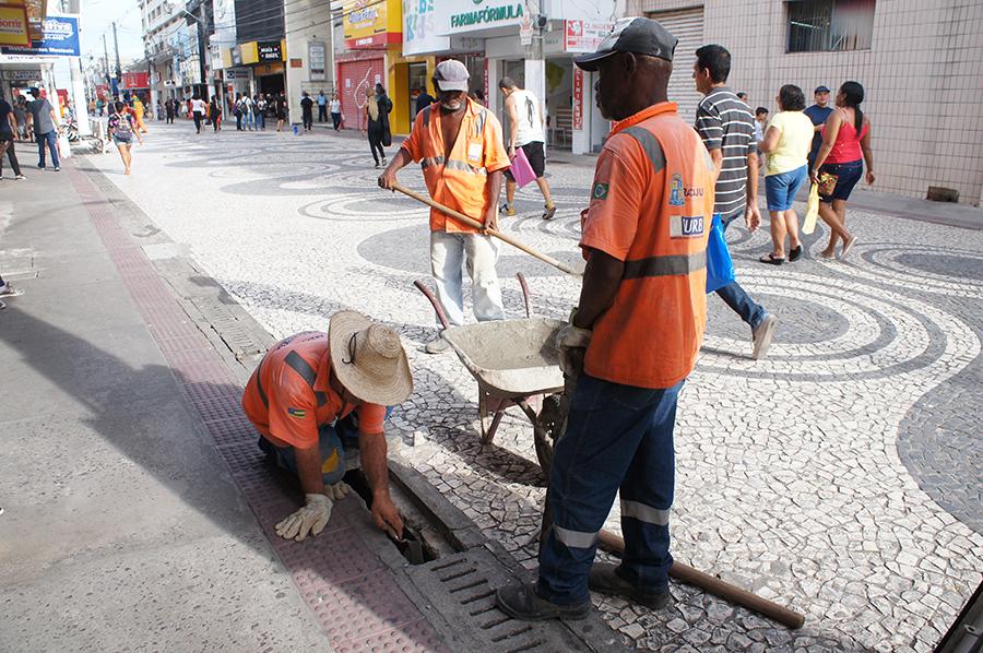 Nesta semana, as frentes de trabalho atuam na região central equacionando demandas na parte estrutural dos calçadões e espaços públicos. Além do remanejamento de grelhas que cobrem as canaletas que servem como escorredouro para as águas das chuvas, também foram realizados a reconstrução dos meios-fios e do piso danificado.