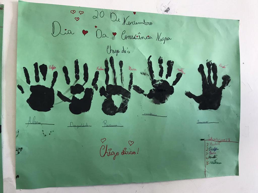 “Entre os trabalhos, realizamos sessões de cinema nas quais exibimos curtas-metragens dentro dessa temática, mas de acordo com a idade deles. Os do 6° ano assistiram o curta Dudu e o Lápis Cor de Pele, já os do 9° ano viram o curta O que é Ser Negro no Brasil. Precisamos conscientizar nossos alunos, pois é através da Educação que vamos superar este racismo que ainda existe muito forte, mesmo o Brasil sendo um país em que praticamente todos os habitantes nascidos aqui têm descendência negra”, explica a coordenadora pedagógica da Emef, Débora de Azevedo Déda.