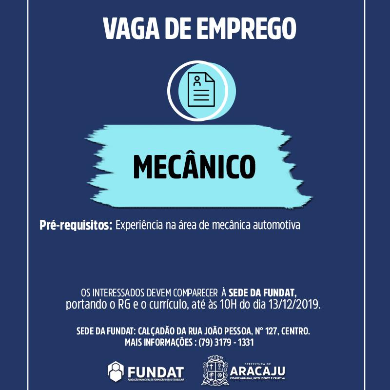 A Prefeitura de Aracaju, por meio da Fundação Municipal de Formação para o Trabalho (Fundat), anuncia a oferta de nova vaga de emprego para a função de mecânico. Para participar da seleção, é necessário ter ensino médio completo e experiência na área de mecânica automotiva.