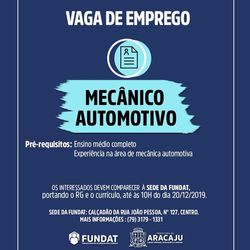 A Prefeitura de Aracaju, por meio do serviço de encaminhamento de cidadão qualificados ao mercado de trabalho, desenvolvido pela Fundação Municipal de Formação para o Trabalho (Fundat), anuncia nesta segunda-feira, 16, nova vaga de emprego para a função de mecânico automotivo.