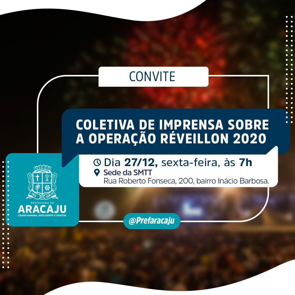 A Prefeitura de Aracaju realiza nesta sexta-feira, 27, às 7h, uma coletiva de imprensa para apresentar os detalhes da operação Réveillon 2020. A apresentação será realizada na sede da Superintendência Municipal de Transporte e Trânsito (SMTT), localizada na rua Roberto Fonseca, nº 200, bairro Inácio Barbosa.