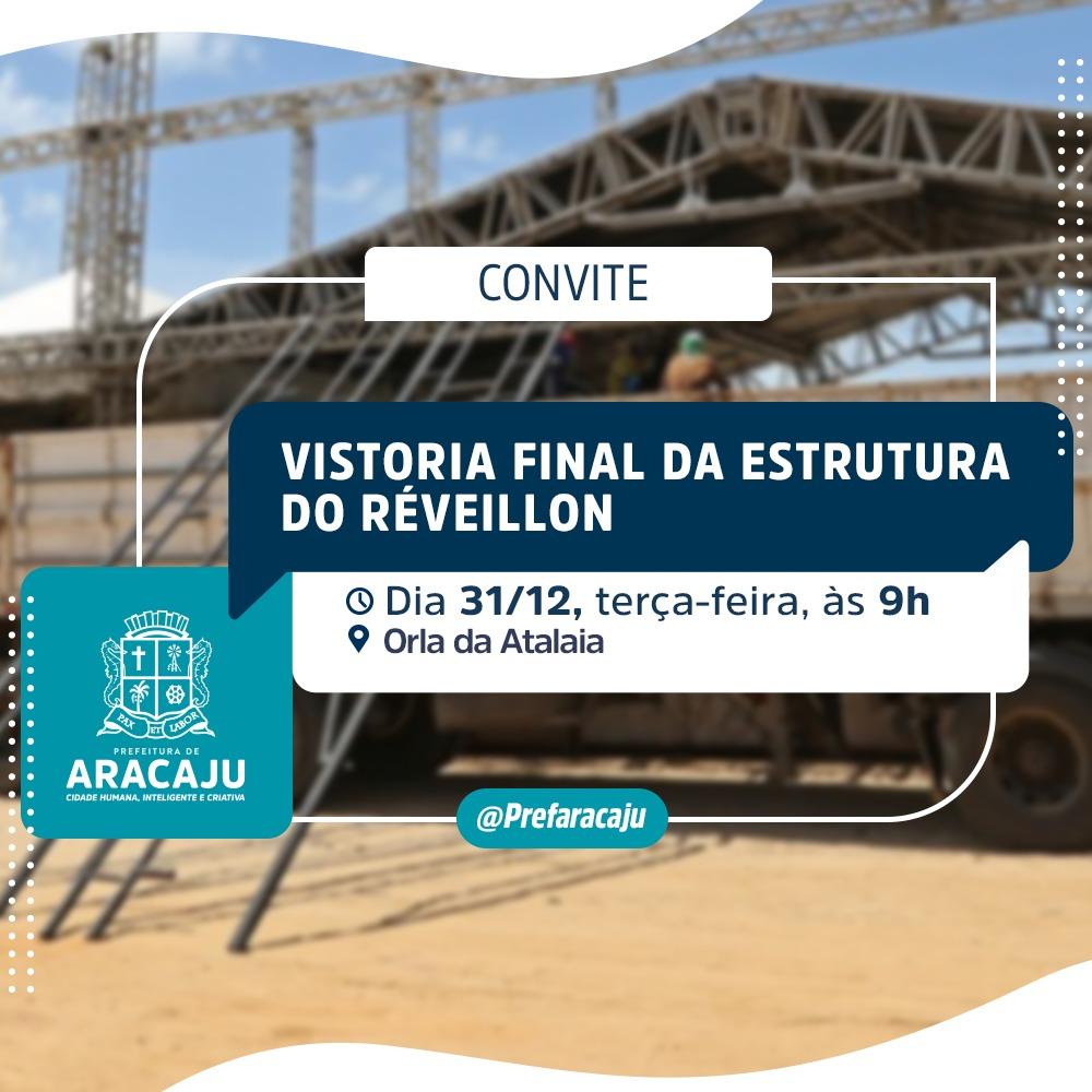 A Prefeitura de Aracaju realizará a vistoria final da estrutura montada para a realização da festa de Réveillon 2020, na Orla da Atalaia nesta terça-feira, dia 31, às 9h. O prefeito Edvaldo Nogueira estará presente e irá acompanhar a Defesa Civil de Aracaju e o Corpo de Bombeiros. A estrutura da festa é formada por dois palcos, dois camarotes e camarins.