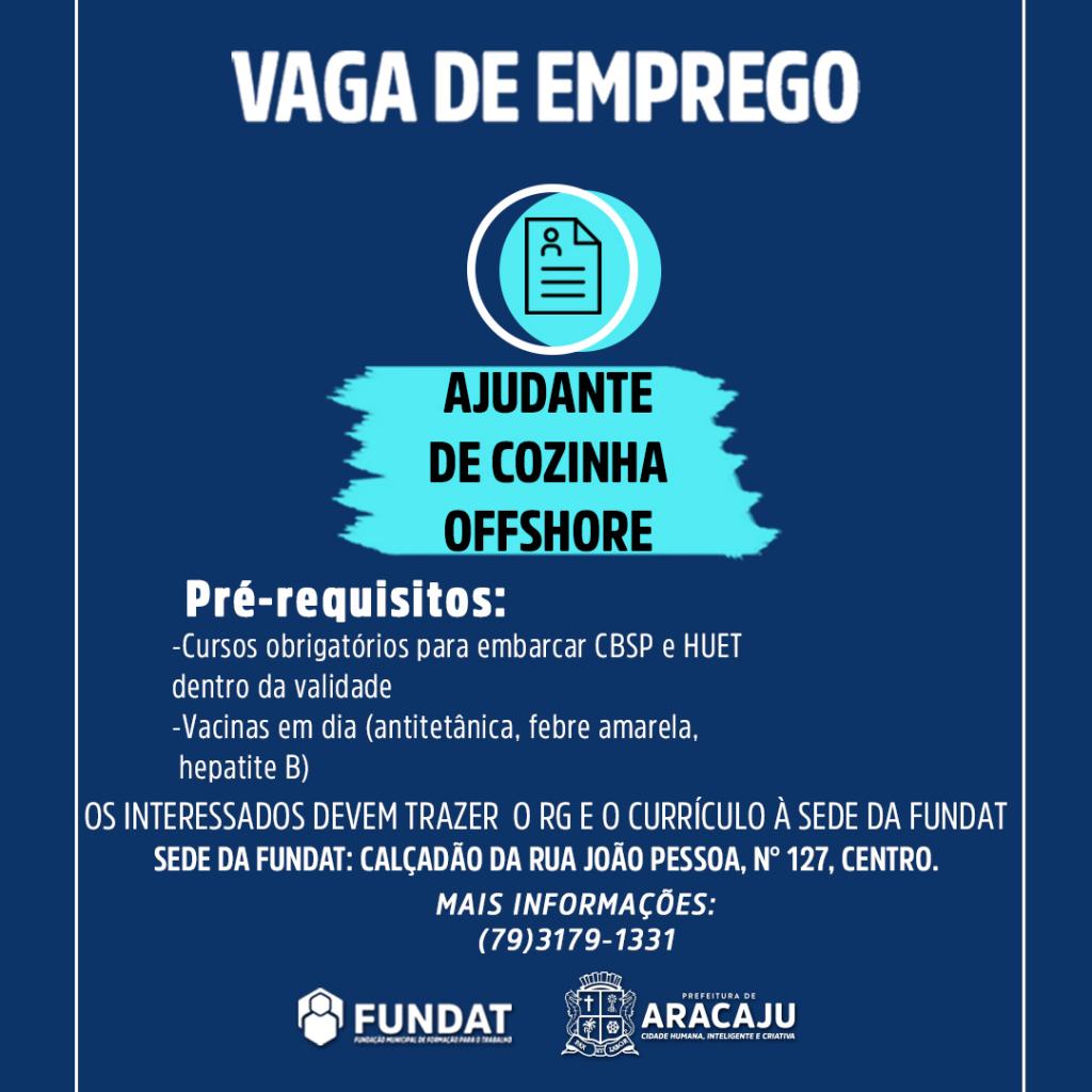A Prefeitura de Aracaju, por meio do Serviço de Encaminhamento de Mão de Obra ao Mercado de Trabalho, executado pela Fundação Municipal de Formação para o Trabalho (Fundat), anuncia a oferta de novas vagas de emprego para trabalho embarcado, para taifeiro e ajudante de cozinha.