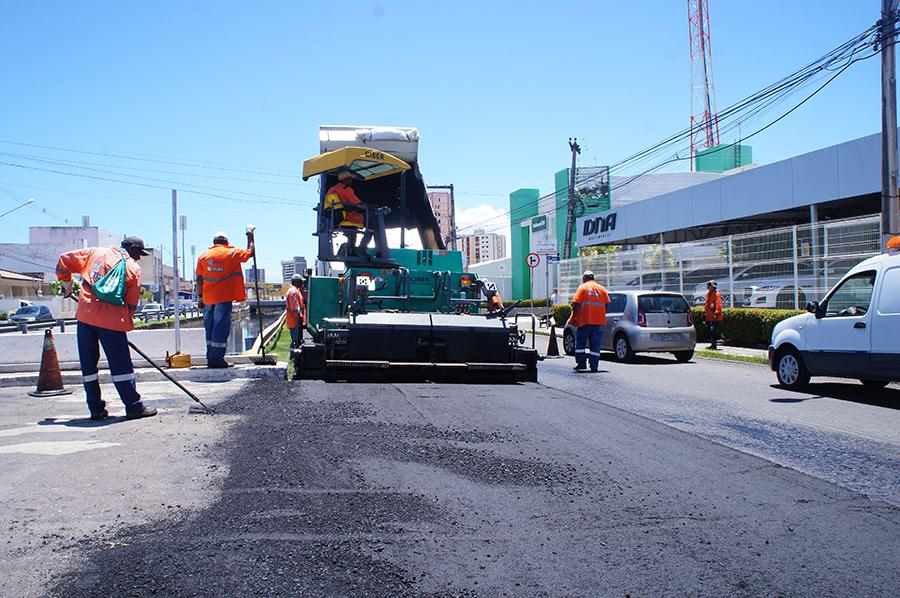 Após fresar – retirar – o asfalto de todo o trecho danificado, os operários da Emurb já iniciaram a aplicação da nova camada de asfalto no sentido sul da avenida Anísio Azevedo