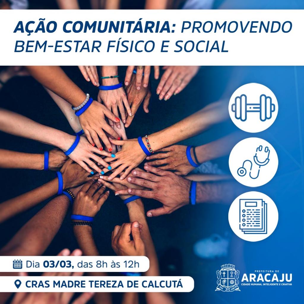 A Prefeitura de Aracaju, por meio da Secretaria Municipal da Assistência Social, realizará nesta terça-feira, dia 3, das 8h às 12h, a ação comunitária “Promovendo Bem-estar Físico e Emocional”, no Centro de Referência da Assistência Social (Cras) Madre Tereza de Calcutá, no Largo da Aparecida, bairro Jabotiana.