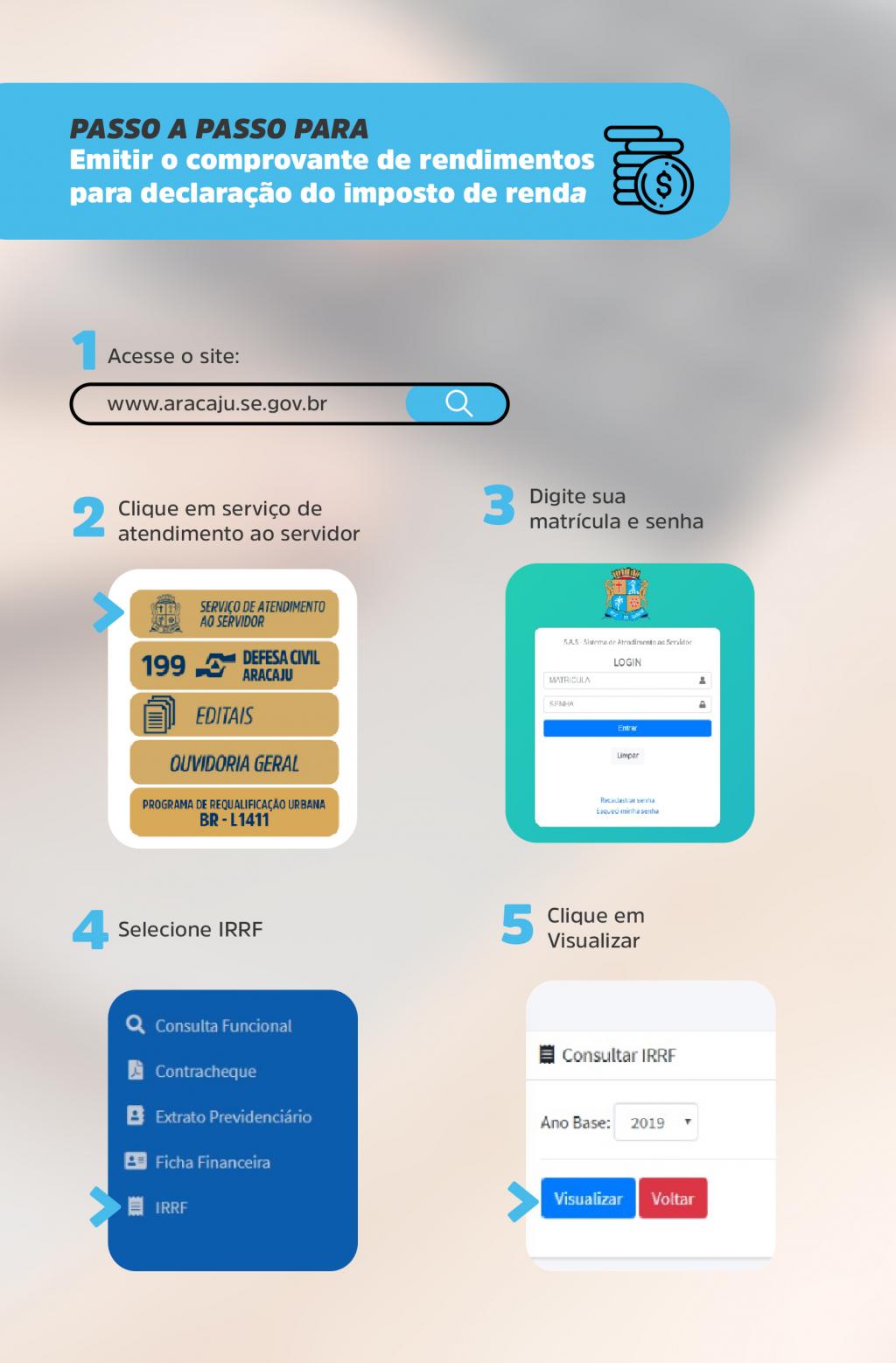 Para verificar e imprimir o comprovante, o servidor deve acessar o endereço eletrônico www.aracaju.se.gov.br e clicar no ícone "Serviço de Atendimento ao Servidor", localizado no lado direito da página. Em seguida, deve digitar o número da matrícula e a senha de acesso, e clicar em "Entrar". Despis, no Menu Principal, após clicar na opção "IRRF", verificar se o ano base é 2019 e, por fim, clicar em "Visualizar". Feito isso, o comprovante já pode ser impresso.