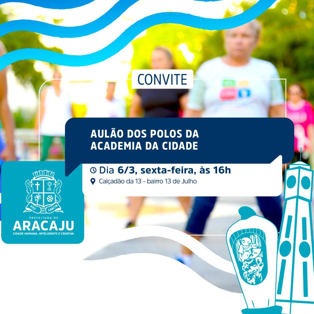 A Prefeitura de Aracaju convida a todos para um aulão dos polos da Academia da Cidade, que acontece nesta sexta-feira, 6, às 16h, na quadra de esportes localizada próximo ao polo do PAC Dr. Costa Pinto, localizado no calçadão do bairro Treze de Julho. O ato integra a programação do Aniversário de 165 Anos de Aracaju.