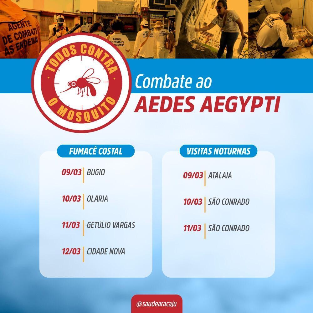 Seguindo o Plano de Intensificação das Ações de Combate ao Aedes aegypti, a Prefeitura de Aracaju, por meio da Secretaria Municipal da Saúde (SMS) divulga, nesta segunda-feira, 9, as ações de combate ao mosquito que serão desenvolvidas ao longo desta semana. A mobilização tem como meta combater o Aedes e evitar epidemias e óbitos em decorrência de doenças como a dengue, zika e chikungunya.