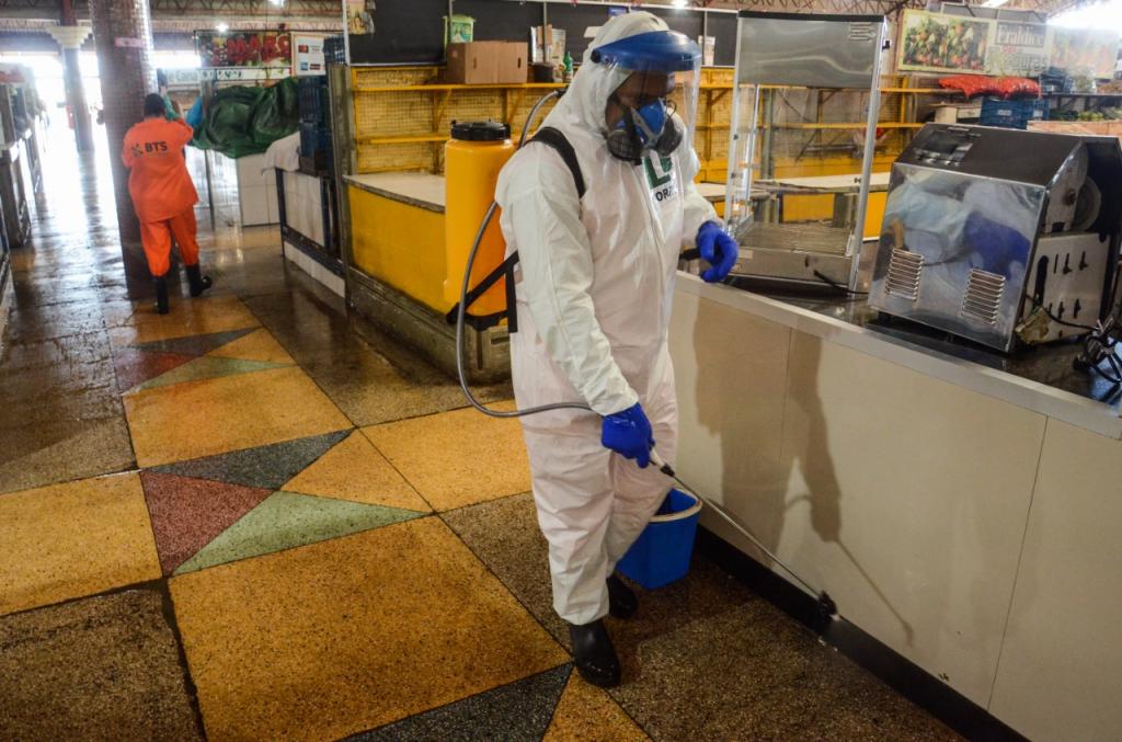 O serviço de esterilização também foi realizado nos ambientes internos do mercado. No piso superior, os agentes aplicaram o hipoclorito nas portas, corrimões e colunas. O mesmo aconteceu nos espaços de comercialização de pescados, carnes, cereais e hortifruti.