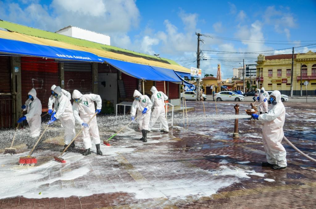 O trabalho de higienização iniciado pela área externa do centro de compras, foi realizado por etapas. No primeiro momento, os agentes fizeram a retirada de resíduos e lavagem dos espaços, e logo em seguida outra equipe executou a pulverização com uma solução de hipoclorito de sódio, produto antibactericida e esterilizante.