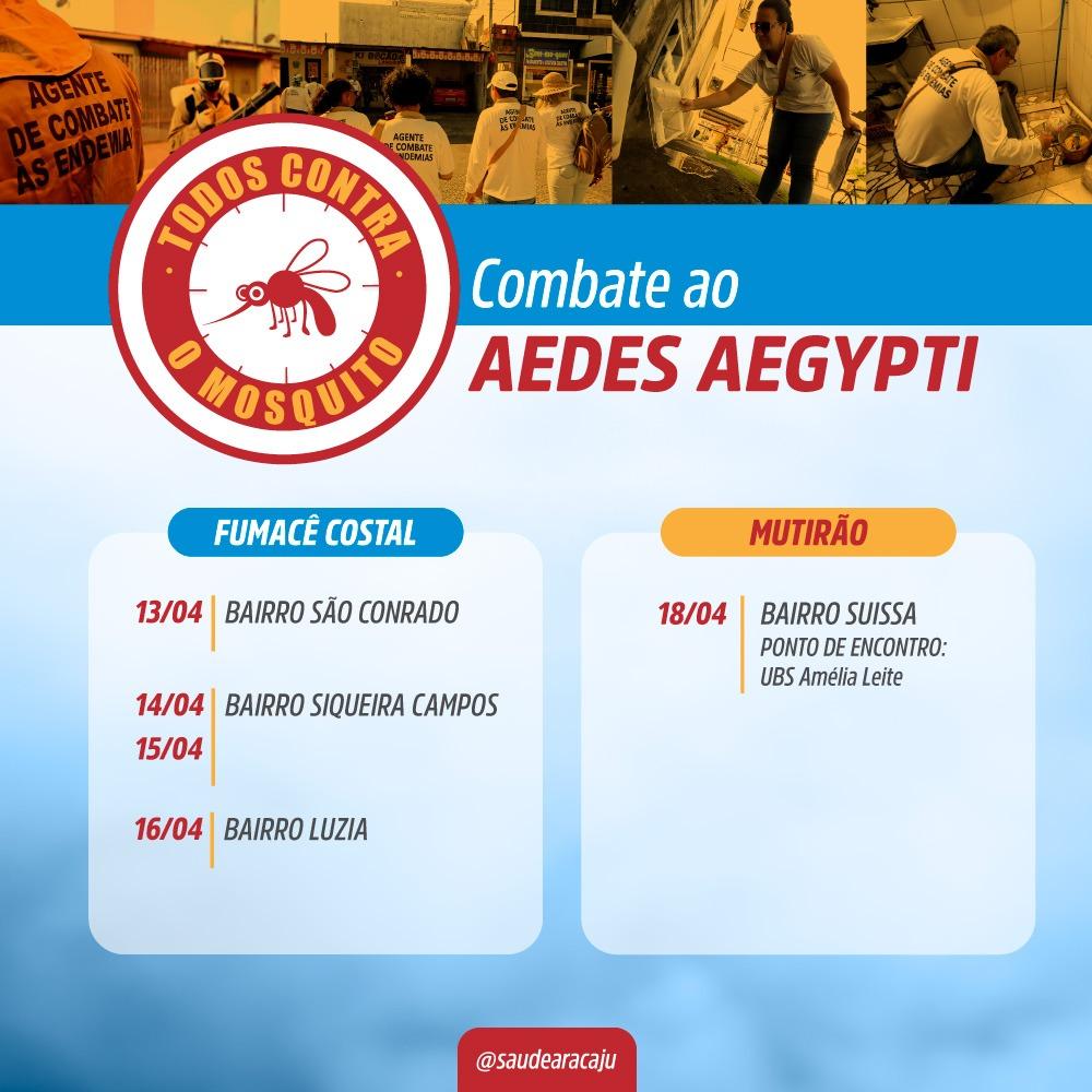 Seguindo o Plano de Intensificação das Ações de Combate ao Aedes aegypti, a Prefeitura de Aracaju, por meio da Secretaria Municipal da Saúde (SMS), divulga, nesta segunda-feira, 13, as ações de combate ao mosquito Aedes aegypti que serão desenvolvidas ao longo desta semana. A mobilização tem como meta combater o vetor e evitar epidemias e óbitos em decorrência de doenças como a dengue, zika e chikungunya.