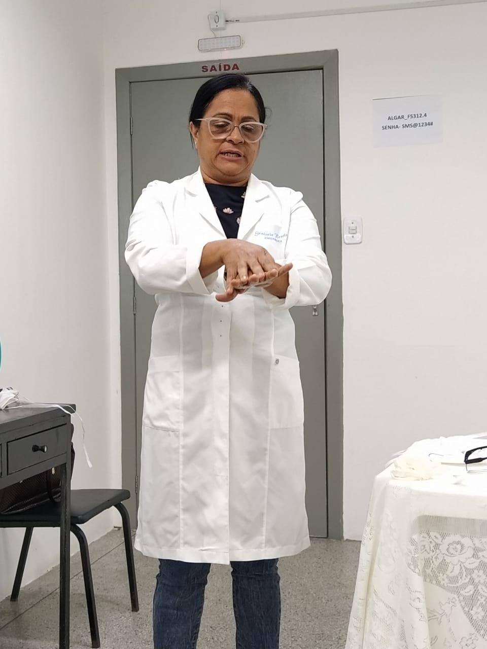 A enfermeira Genisete Santos orientou os profissionais sobre os cuidados básicos no momento de utilização dos EPIs, visto que a contaminação pode ocorrer durante a retirada dos equipamentos após o atendimento com o paciente infectado.