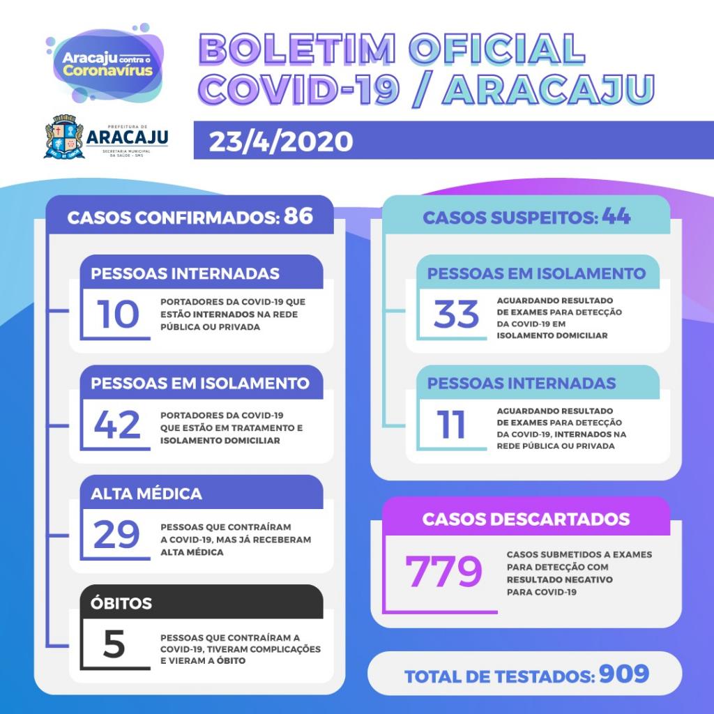 Com isso, sobe para 86 o número de pessoas diagnosticadas com covid-19 em Aracaju. Destas, dez estão internadas em hospitais; 42 estão em isolamento domiciliar; 29, que estavam infectadas, já receberam alta médica; e cinco vieram a óbito.