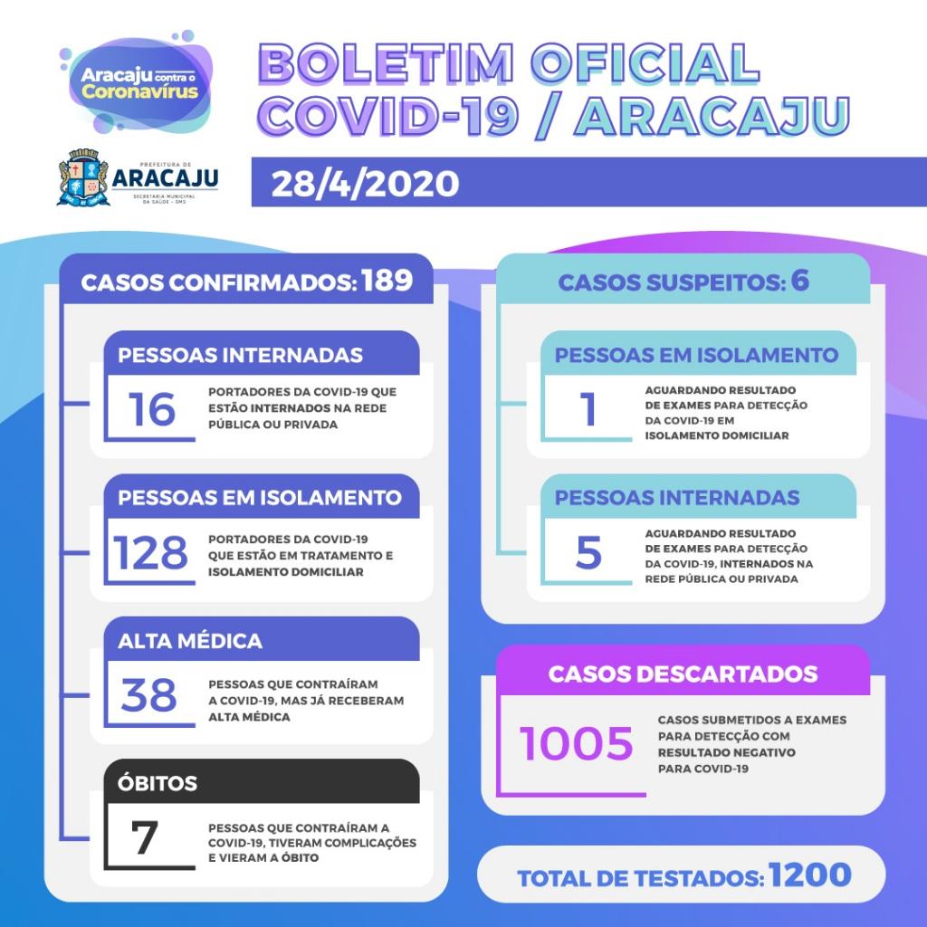Com isso, sobe para 189 o número de pessoas diagnosticadas com Covid-19 em Aracaju. Destas, 16 estão internadas em hospitais; 128 estão em isolamento domiciliar; 38, que estavam infectadas, já receberam alta médica; e sete vieram a óbito.