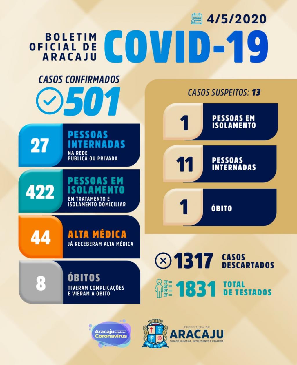 Com isso, sobe para 501 o número de pessoas diagnosticadas com Covid-19 em Aracaju. Destas, 27 estão internadas em hospitais; 422 estão em isolamento domiciliar; 44, que estavam infectadas, já receberam alta médica; e oito vieram a óbito.
