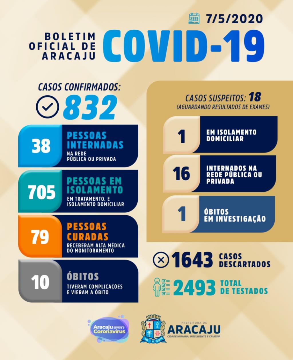 Com isso, sobe para 832 o número de pessoas diagnosticadas com covid-19 em Aracaju. Destas, 38 estão internadas em hospitais; 705 estão em isolamento domiciliar; 79, que estavam infectadas, já estão curadas; e dez vieram a óbito.