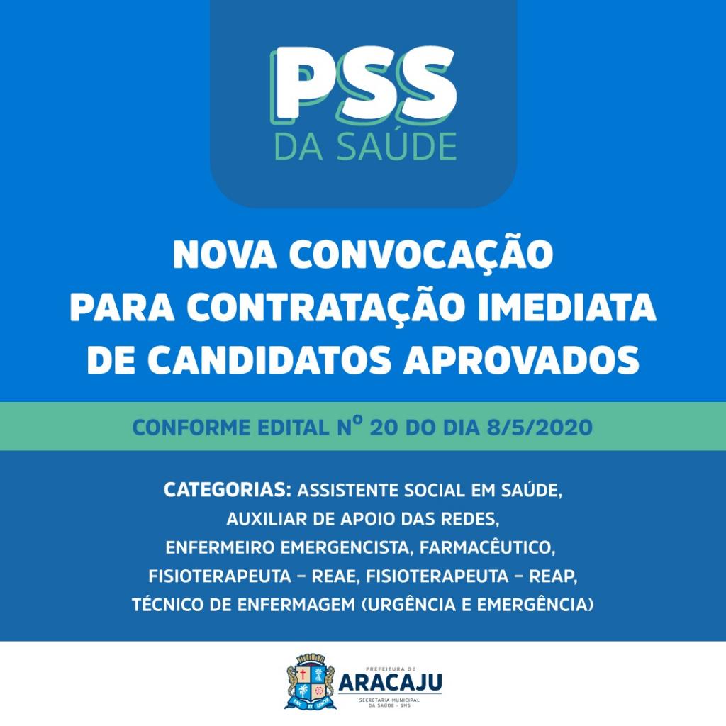 A Prefeitura de Aracaju, por meio da Secretaria Municipal da Saúde (SMS), está convocando diversos profissionais aprovados no Processo Seletivo Simplificado da Saúde para contratação imediata, para atuação nas ações de combate à covid-19. E, conforme o Edital nº 20, publicado nesta sexta-feira, 8, os candidatos aprovados para os cargos de Assistente Social em Saúde, Auxiliar de Apoio das Redes, Enfermeiro – Emergencista, Farmacêutico, Fisioterapeuta – REAE, Fisioterapeuta – REAP e Técnico de Enfermagem – Urgência e Emergência, deverão se apresentar para entrega da documentação e lotação imediata entre os dias 11 e 14 deste mês.