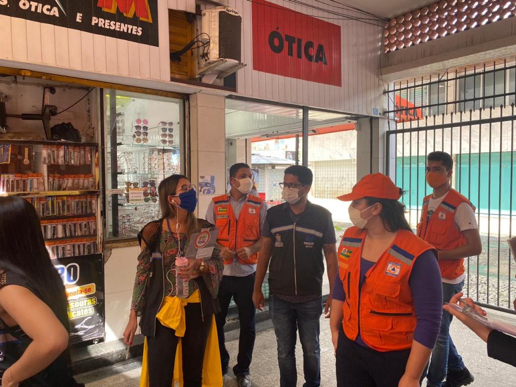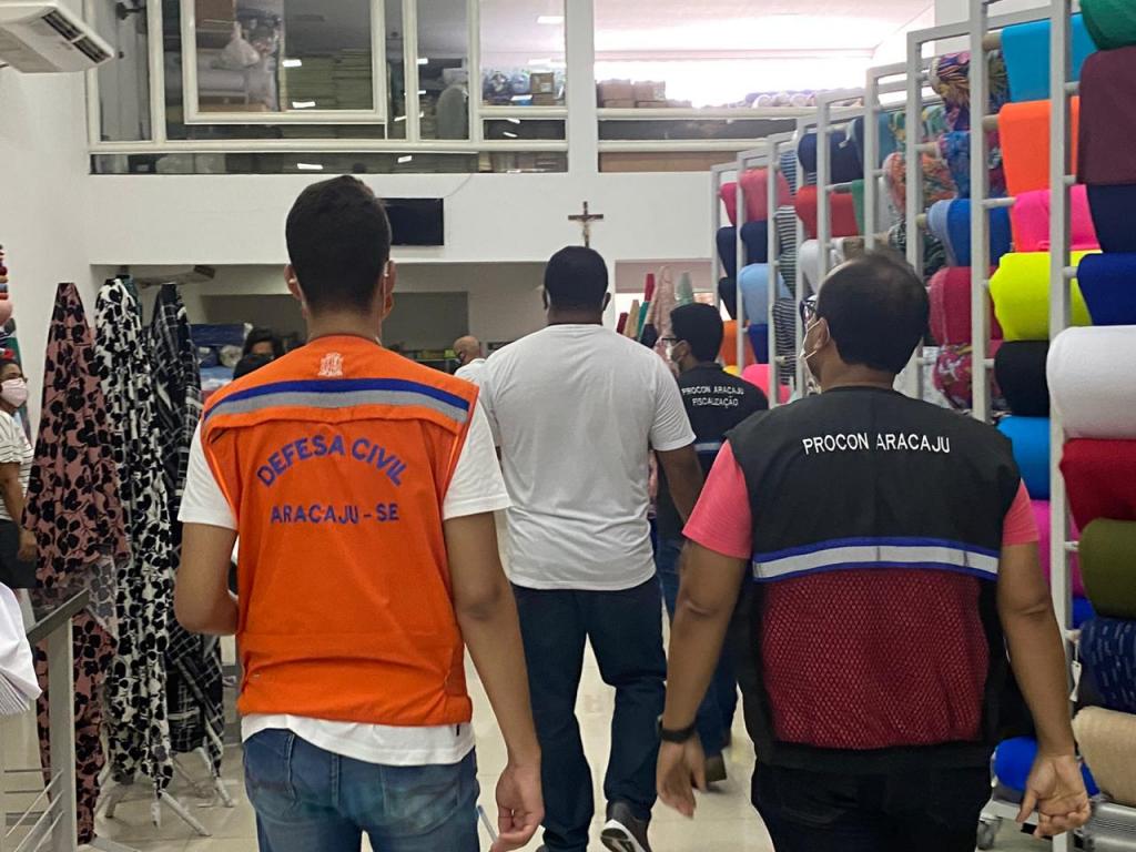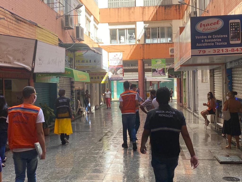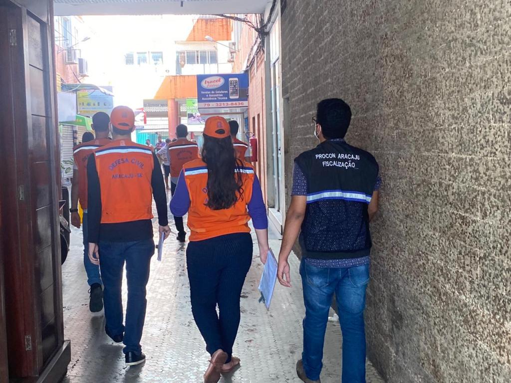 Somente no período da manhã, foram contabilizados 79 estabelecimentos comerciais fiscalizados, durante ronda no Centro da capital. Desse total, 16 foram notificados e oito interditados. Também houve orientação para outros 55 pontos comerciais. Esse trabalho é executado pela Defesa Social do município, através das abordagens de equipes da Defesa Civil, e do Programa Municipal de Proteção e Defesa do Consumidor (Procon Aracaju), com o apoio da Guarda Municipal de Aracaju (GMA).