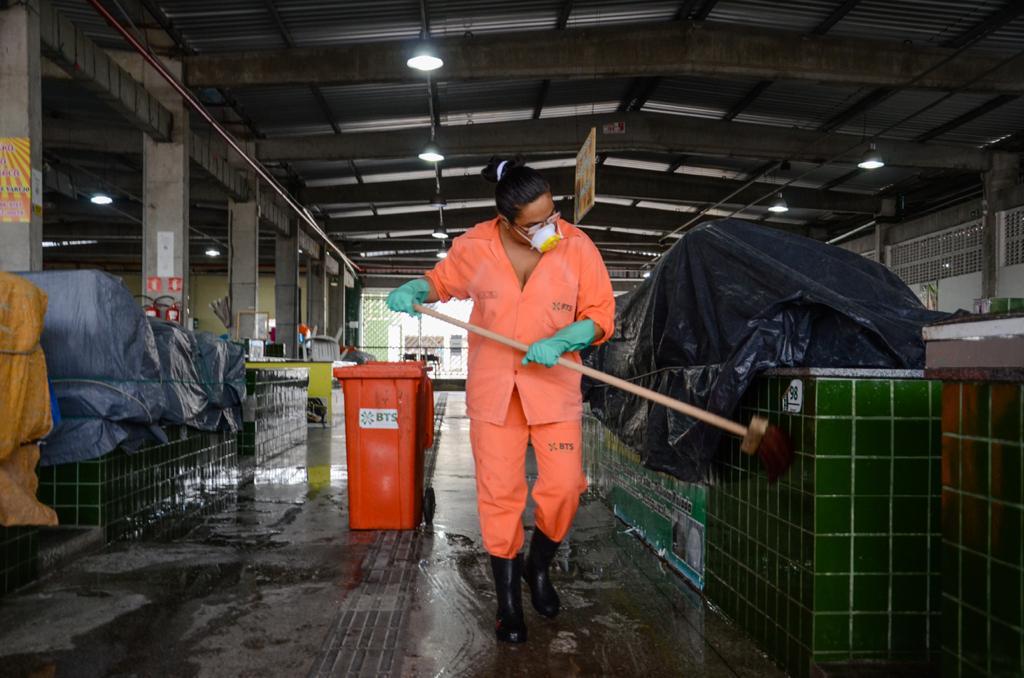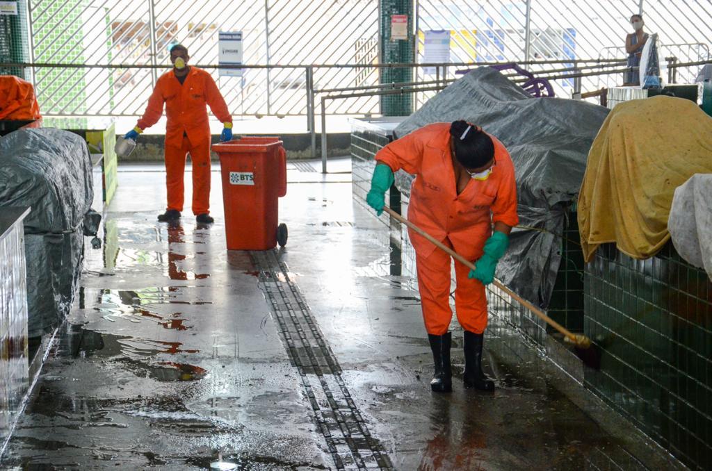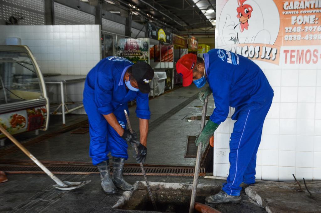 Além dos serviços habituais de varrição, retirada de resíduos, lavagem do piso e boxes em todos os setores de comercialização, o local recebeu reparos nas portas, desinfecção de corrimões, colunas e mobiliários da área administrativa, e a desobstrução da rede interna e externa de esgoto, feita em parceria com uma equipe da Empresa Municipal de Obras e Urbanização (Emurb).