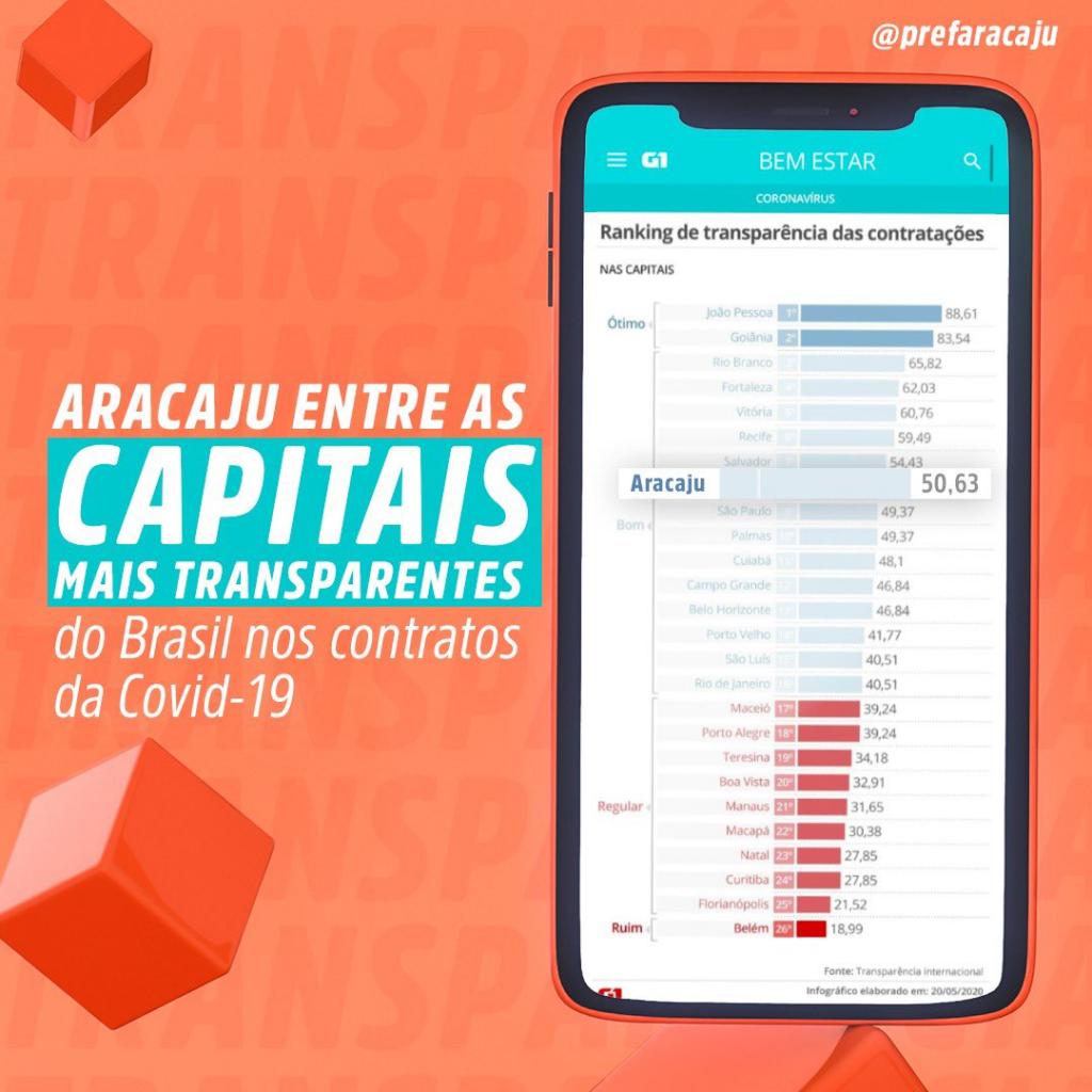 Um levantamento da ONG Transparência Internacional, divulgado nesta quinta-feira, 21, classifica Aracaju com o índice Bom, de transparência nas contratações emergenciais realizadas durante a pandemia de covid-19. A ONG analisou os sites, redes sociais e portais de transparência dos governos de todos os 26 estados e do Distrito Federal e de todas as 27 capitais.