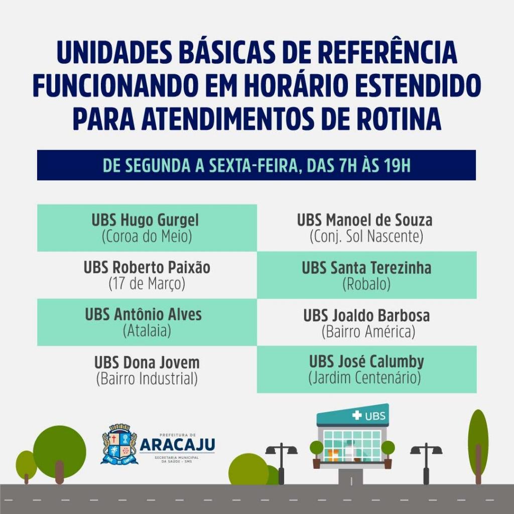 Com relação às unidades em horário estendido, a assessora técnica da Rede de Atenção Primária da SMS, Michelle Dias, afirmou que essa foi uma ação que visou atender às solicitações da própria população. Até o momento, são oito as unidades que estão trabalhando em horário diferenciado, de segunda a sexta, das 7h às 19h: Hugo Gurgel (Coroa do Meio), Roberto Paixão (17 de Março), Antônio Alves (Atalaia); Dona Jovem (Bairro Industrial), Manoel de Souza (conjunto Sol Nascente), Santa Terezinha (Robalo), Joaldo Barbosa (Bairro América) e José Calumby (Jardim Centenário).
