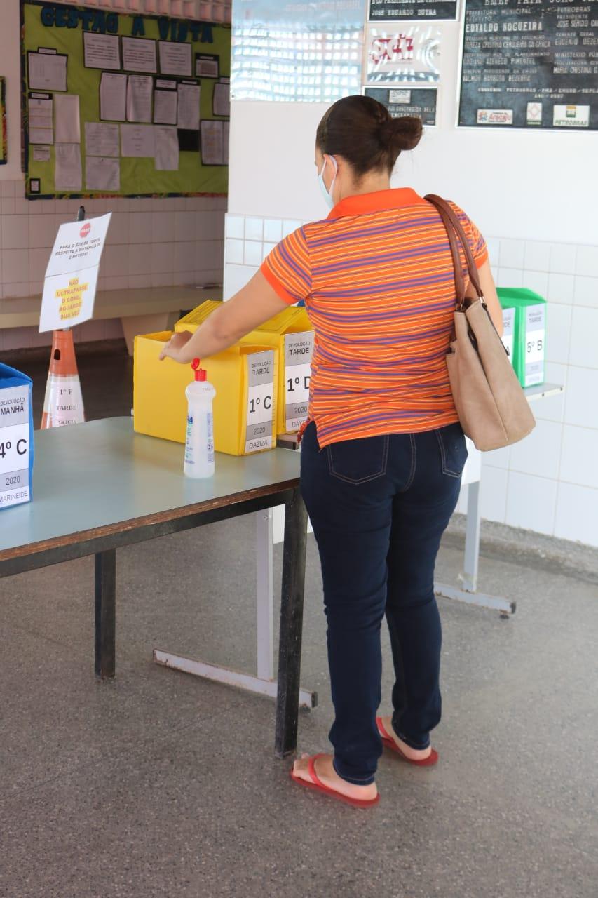 No bairro Santa Maria, os alunos da Escola Municipal de Ensino Fundamental (Emef) Papa João Paulo II continuam estudando durante a quarentena. Quinzenalmente, os pais vão à escola para entregar as atividades respondidas e retirar uma nova apostila com exercícios. Para garantir a segurança dos pais e também dos funcionários da unidade, todo o espaço está sinalizado com orientações sobre cuidados com a higiene e distanciamento.