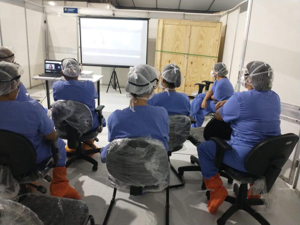 “É muito importante a troca de informações entre o saber da academia e o serviço público. E aqui, no Hospital de Campanha, os profissionais poderão reforçar os fluxos práticos de atendimento aos pacientes internados, desde o processo de trabalho individual até os procedimentos que exigem uma interação multiprofissional. Durante esses dois dias, foram capacitados 30 profissionais, divididos em turmas de dez pessoas, e esse treinamento tem sido constante para todas as categorias que atuam na unidade”, explica Jane.