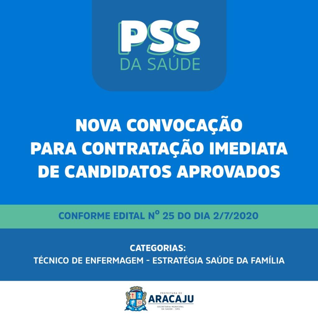 A Prefeitura de Aracaju, por meio da Secretaria Municipal da Saúde (SMS), tornou público, nesta sexta-feira, 3, o Edital nº 25, de convocação de profissionais aprovados no Processo Seletivo Simplificado (PSS) da Saúde para contratação imediata de Técnicos de Enfermagem – estratégia em Saúde da Família.