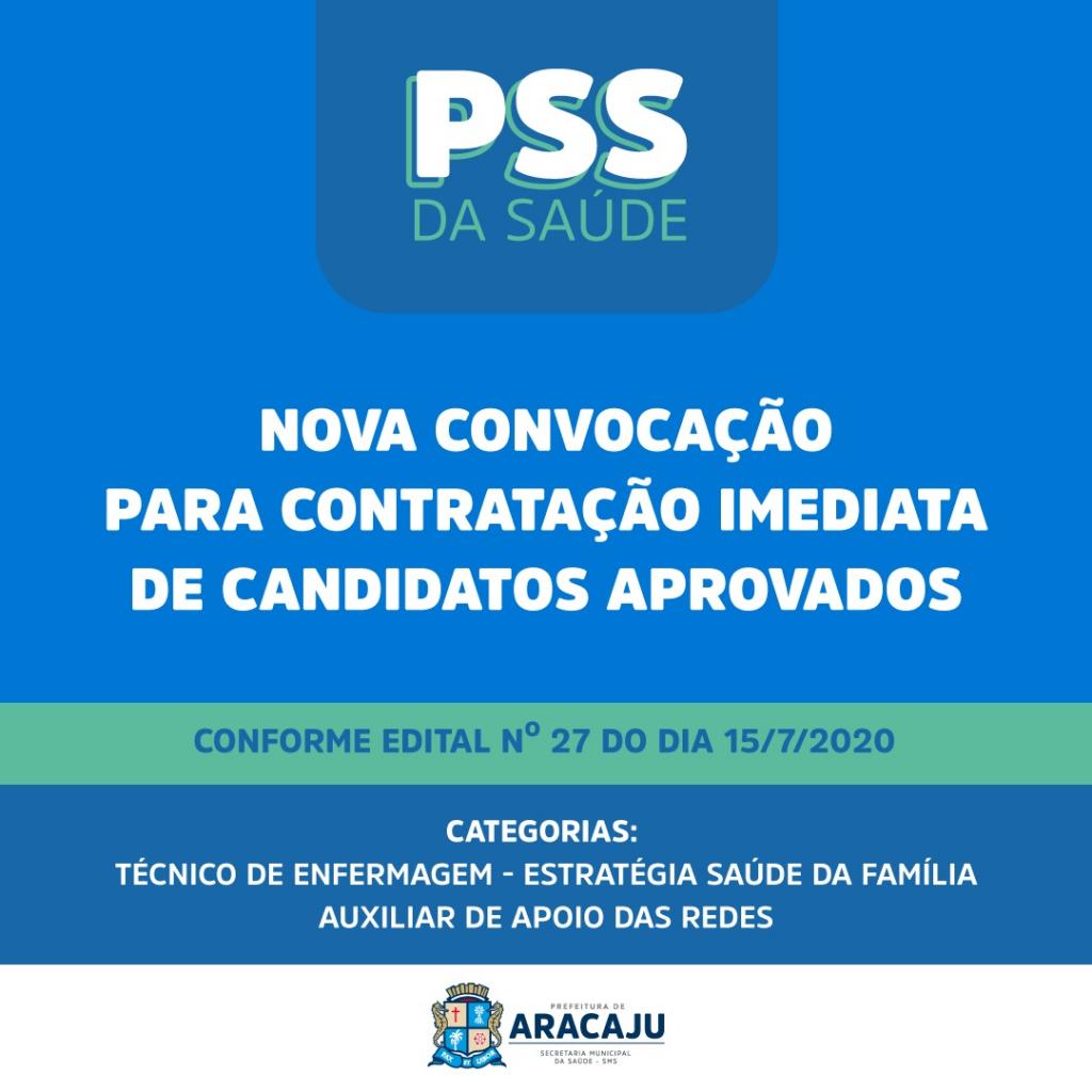 A Prefeitura de Aracaju, por meio da Secretaria Municipal da Saúde (SMS), tornou público, nesta quarta-feira, 15, o Edital nº 27, de convocação de profissionais aprovados no Processo Seletivo Simplificado (PSS) da Saúde, para contratação imediata para os cargos de Auxiliar de Apoio das Redes e Técnico de Enfermagem – Estratégia em Saúde da Família.