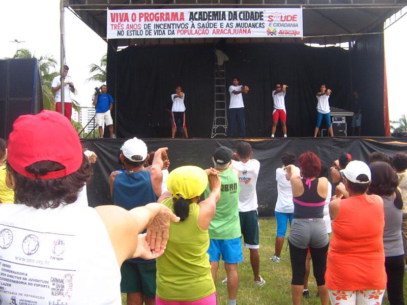 A Prefeitura Municipal de Aracaju (PMA), por intermédio da Secretaria Municipal de Saúde (SMS), comemorou os três anos do projeto Academia da Cidade. O evento ocorreu na manhã do último sábado, dia 5, e reuniu cerca de 400 pessoas no Parque da Sementeira. Com mais de 2 mil participantes distribuídos atualmente em 15 bairros de Aracaju, o projeto deverá ser ampliado para atender aos anseios da própria população. Nós temos o objetivo de ampliar as práticas corporais que nós já fazemos e de buscar implementar o Academia da Cidade em mais bairros, pois temos recebido constantemente a solicitação das comunidades. Com isso, vamos ter um acréscimo no número de participantes e, como conseqüência, a melhoria da saúde e da qualidade de vida de mais de 2 mil pessoas da nossa população; essa é a nossa finalidade principal, afirmou o coordenador do projeto Bráulio César. Segundo ele, os aracajuanos incorporaram o Academia da Cidade ao seu dia-a-dia. Diariamente, em média, 800 pessoas estão em seus respectivos bairros realizando caminhadas, tendo aulas de ginástica, fazendo alongamentos, entre outras atividades físicas. O coordenador salientou que o sucesso do Academia se deve ao projeto que foi bem elaborado e teve o suporte da SMS e da Universidade Federal de Sergipe (UFS), por meio do Grupo de Pesquisa de Aptidão Física. Moradora do bairro América, a dona de casa Maria Euli da Cruz, 59, revelou que tinha problemas com a pressão arterial e que, com as atividades do Academia da Cidade, sua saúde só tem melhorado. Além de me sentir bem, mais saudável e mais disposta para tudo, eu distraio minha cabeça, brinco com as colegas e até passei a participar das tarefas da igreja com mais interesse, disse, ao acrescentar e elogiar o trabalho dos profissionais de saúde que a acompanham durante os exercícios. Há mais de 10 anos sofrendo com a hipertensão, o aposentado Rivaldo Freire dos Santos, 53, diz que é um alívio conviver com a pressão alta controlada. Eu participo desde o início, há três anos, quando o Academia foi criado, e sinto a diferença na minha saúde. Hoje estou bem melhor, disse Santos, que mora no bairro Industrial, zona norte de Aracaju. Esta melhoria na saúde e na qualidade de vida dos participantes é fato constatado pela coordenadora do Programa de Saúde do Adulto, Tereza Nogueira. A adesão da população é muito boa. Os depoimentos de que a saúde melhorou são freqüentes e espontâneos. Hipertensos, diabéticos, obesos, entre outros, têm apresentado bons resultados e isso nos deixa feliz em ver o trabalho surtindo efeito. O projeto logrou êxito total e só temos a parabenizar toda a equipe da SMS e da UFS, declarou. A programação do sábado teve início às 6 horas da manhã e terminou por volta das 9h. Ao final das atividades, pessoas que aderiram ao projeto e que participam assiduamente do mesmo, em suas unidades de saúde, foram homenageadas com o Certificado de Honra ao Mérito. Gente consciente como a aposentada Maria José dos Santos, a dona Zezé, 82, que faz parte do projeto pela Unidade de Saúde Fernando Sampaio, no bairro Castelo Branco. Eu acho importante participar: dançar, brincar, sorrir. Além de eu aprender muitas coisas, é isso que me faz viver e manter minha saúde, comentou. Dona Zezé revelou que, mesmo antes do projeto Academia da Cidade, já realizava os exercícios físicos há cinco anos, sempre acompanhada pelos profissionais da unidade básica de saúde de seu bairro. Mas agora melhorou ainda mais, elogiou.