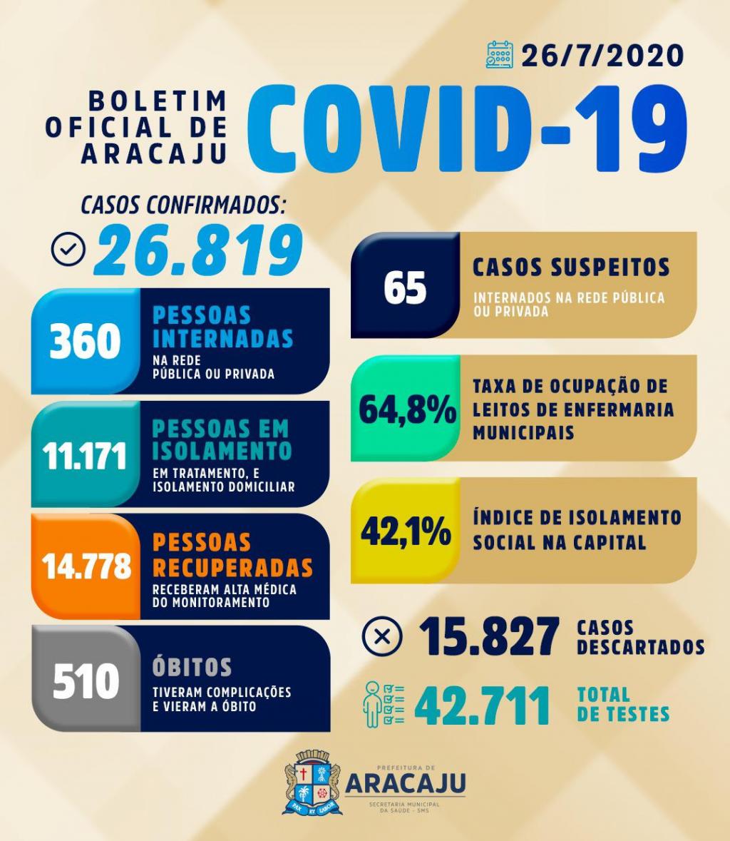 Com isso, sobe para 26.819 o número de pessoas diagnosticadas com covid-19 em Aracaju. Dessas, 360 estão internadas em hospitais; 11.171 estão em isolamento domiciliar; 14.778, que estavam infectadas já estão recuperadas; e 510 vieram a óbito.