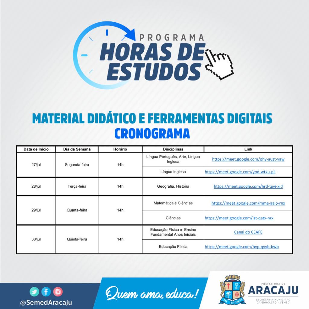 O programa Horas de Estudo retomou as atividades no última dia 6 de julho, com o fim das férias coletivas dos professores da rede municipal de ensino de Aracaju, e prossegue até o dia 28 de agosto deste ano. Além dos temas já abordados, como ensino híbrido e a formação sobre o diário eletrônico, os profissionais também receberão formação sobre outras temáticas, como Educação Infantil em Tempos de Distanciamento Físico.