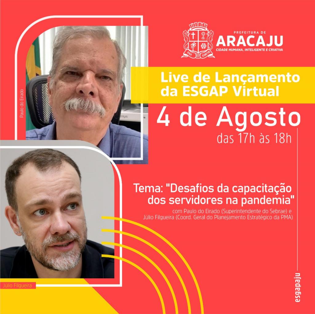 A live de lançamento, que terá como tema “Desafios da capacitação dos servidores na pandemia”, será realizada dia 4 de agosto, às 17h, através do perfil no Instagram da escola (@esgapaju). O encontro será mediado pelo diretor da Esgap, Bosco Rolemberg, e terá a participação do superintendente do Sebrae/SE, Paulo do Eirado, e do coordenador do Planejamento Estratégico e Monitoramento da Prefeitura, Júlio Figueira. Ao longo do mês, outras transmissões ao vivo, com temas variados, serão realizadas.