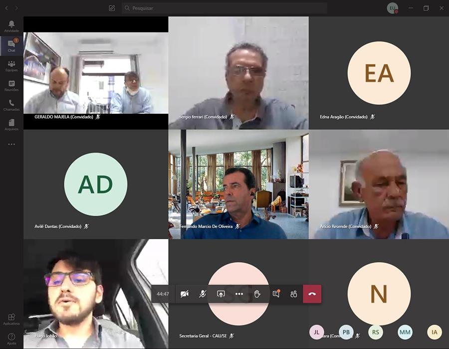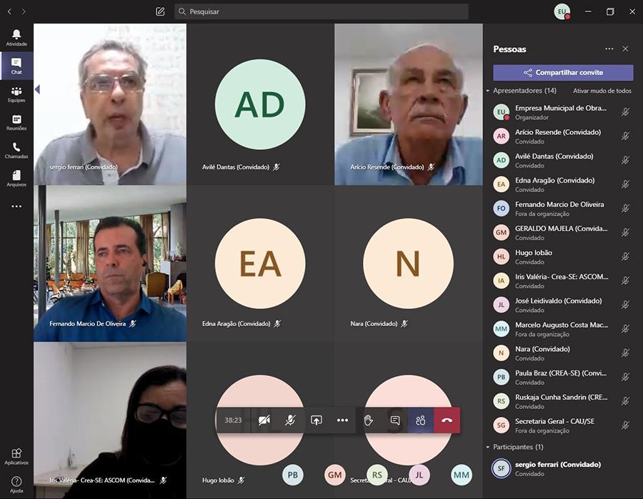 Participaram da videoconferência representantes do Conselho Regional de Engenharia e Agronomia de Sergipe (Crea-SE), do Conselho de Arquitetura e Urbanismo de Sergipe (CAU/SE), da Associação Sergipana dos Empresários de Obras Públicas e Privadas (Aseopp) e da Associação dos Dirigentes das Empresas do Mercado Imobiliário de Sergipe (Ademi/SE).