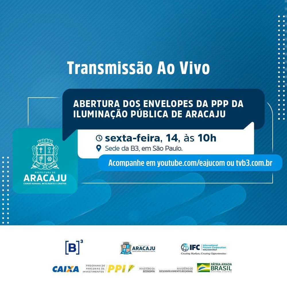 A partir das 10h desta sexta-feira, 14, a Prefeitura de Aracaju estará disponibilizando a transmissão online ao vivo da solenidade de abertura dos envelopes relativos à Parceria Público-Privada (PPP) da Iluminação Pública de Aracaju. Toda a imprensa está convidada a acompanhar por meio do Canal do Youtube da Prefeitura de Aracaju (https://www.youtube.com/eajucom ) ou através do site da empresa Brasil Bolsa Balcão (B3), através do endereço www.tvb3.com.br .