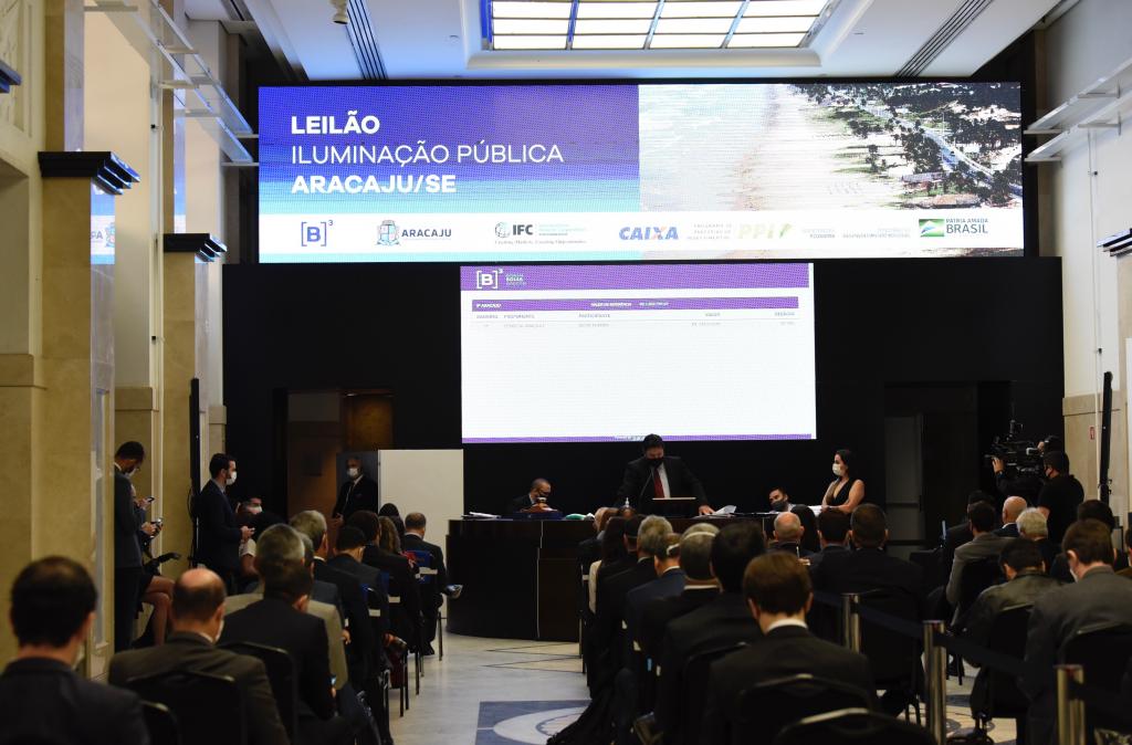 A Prefeitura de Aracaju participou, na manhã desta sexta-feira, 14, de leilão na operadora Bolsa Brasil Balcão (B3), em São Paulo, no qual foi escolhido o consórcio de empresas que modernizará toda a iluminação pública da cidade. A iniciativa colocou a capital sergipana como a primeira cidade do país a realizar uma Parceria Público-Privada, apoiada pelo Fundo de Estruturação de Projetos (FEP) do governo federal. De maneira inédita, Aracaju terá todo o seu parque de iluminação substituído por lâmpadas com tecnologia LED. O prefeito Edvaldo Nogueira participou da cerimônia ao lado do ministro do Desenvolvimento Regional, Rogério Marinho.