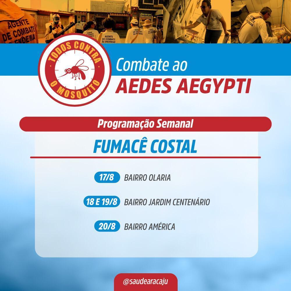 Por meio da Secretaria Municipal da Saúde (SMS), a Prefeitura de Aracaju segue realizando durante a semana a aplicação do fumacê costal no combate ao Aedes aegypti, para evitar a proliferação do mosquito transmissor da dengue, chikungunya e zika. Na segunda-feira, 17, o fumacê costal esteve no bairro Olaria. Nesta terça-feira, dia 18, e na quarta, 19, os agentes estarão no bairro Jardim Centenário, e no dia 20 será a vez do bairro América.