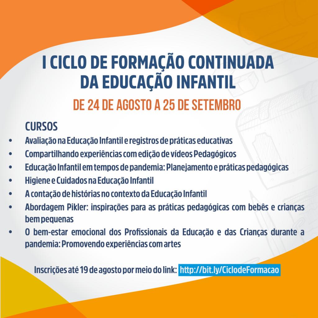 O ciclo de formação será promovido pela Coordenadoria de Educação Infantil (Coeinf), em articulação com o Centro de Aperfeiçoamento e Formação Continuada da Educação (Ceafe), e tem como público-alvo professores da sala regular, professores das salas de recursos multifuncionais, suportes pedagógicos, diretores e coordenadores que atuam na Educação Infantil.