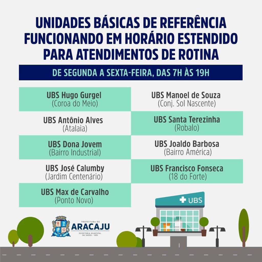 As Unidades que estão trabalhando em horário diferenciado, de segunda a sexta, das 7h às 19h, são: Hugo Gurgel (Coroa do Meio), Francisco Fonseca (18 do Forte), Max Carvalho (Ponto Novo), Antônio Alves (Atalaia); Dona Jovem (Bairro Industrial), Manoel de Souza (conjunto Sol Nascente), Santa Terezinha (Robalo), Joaldo Barbosa (Bairro América) e José Calumby (Jardim Centenário).