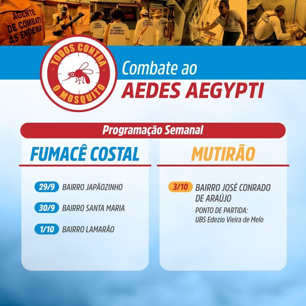 Nesta terça-feira (29), o fumacê estará no bairro Japãozinho. Na quarta-feira (30), as equipes estarão no Santa Maria e quinta-feira, dia 1° de outubro, no Lamarão. Já o mutirão, que ocorrerá sábado, dia 3, será no bairro José Conrado, saindo da UBS Edézio Vieira de Melo.
