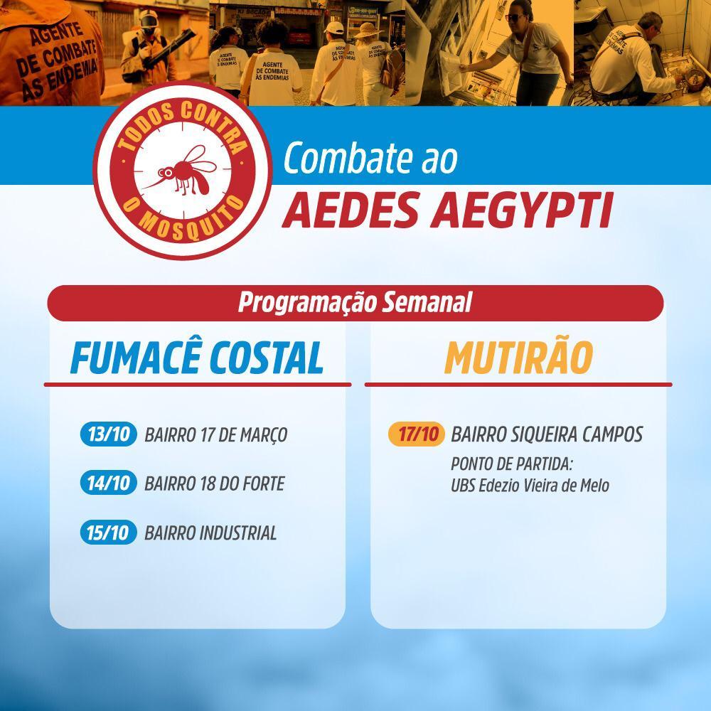 Por meio da Secretaria Municipal da Saúde (SMS), a Prefeitura de Aracaju segue realizando, durante a semana, a aplicação do fumacê costal no combate ao Aedes aegypti para evitar a proliferação do mosquito transmissor da dengue, chikungunya e zika. Nesta terça-feira, 13, a equipe do fumacê costal está no bairro 17 de Março, na quarta-feira, 14, os agentes estarão no bairro 18 do forte e, no dia 15, será a vez do bairro Industrial.