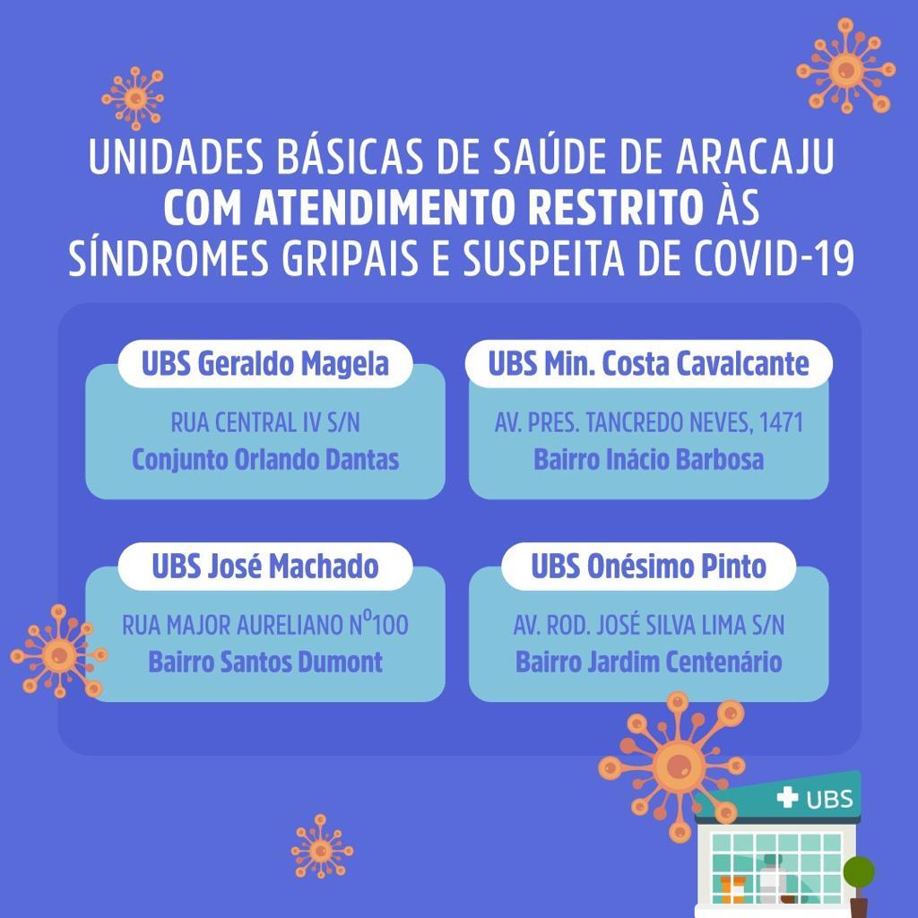 A Saúde de Aracaju oferta 44 salas de vacinação, dispostas nas Unidades Básicas de Saúde (UBS). Porém, por conta da pandemia, quatro destas UBS restringiram o atendimento para casos de síndromes gripais e não estão vacinando, são as UBSs Geraldo Magela, Ministro Costa Cavalcante, José Machado e Onésimo Pinto.