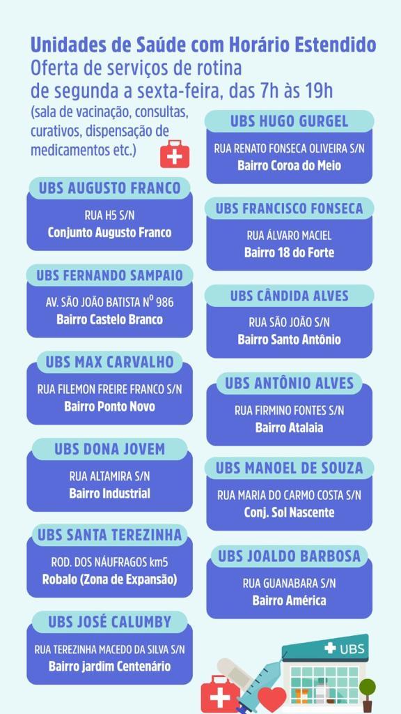 No momento, 28 Unidades Básicas de Saúde estão com as salas de vacinação funcionando de forma rotineira, das 8h às 16h30. Outras 12 unidades estão com horário de atendimento estendido até as 18h30. São elas: UBS Hugo Gurgel, UBS Augusto Franco, UBS Francisco Fonseca, UBS Fernando Sampaio, UBS Dona Jovem, UBS Max Carvalho, UBS Santa Terezinha, UBS Antônio Alves, UBS Manoel de Souza, UBS Joaldo Barboza, UBS Cândida Alves e UBS José Calumby.