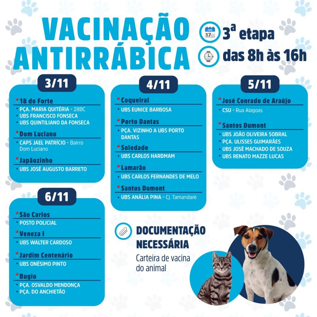 A terceira etapa da campanha de vacinação acontece entre 3 e 6 de novembro. No primeiro dia, a ação contempla os bairros 18 do Forte, Dom Luciano e Japaozinho. No dia 4, as equipes estarão no Coqueiral, Porto D’antas, Soledade, Lamarão e Santos Dumont.