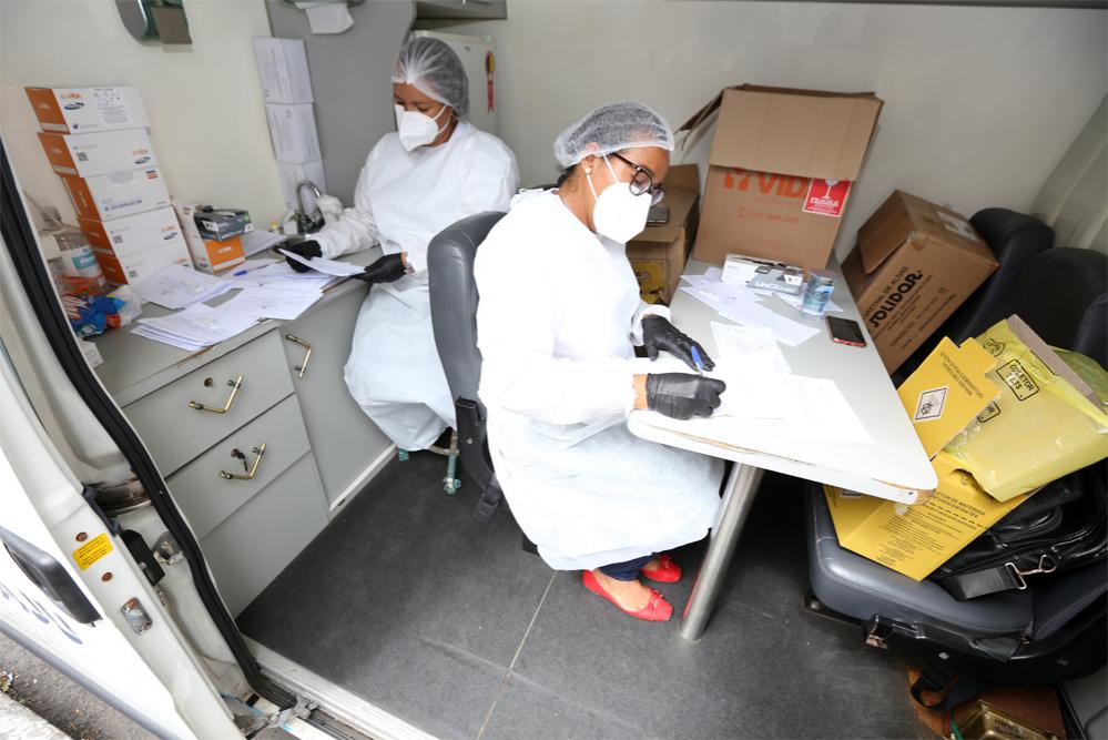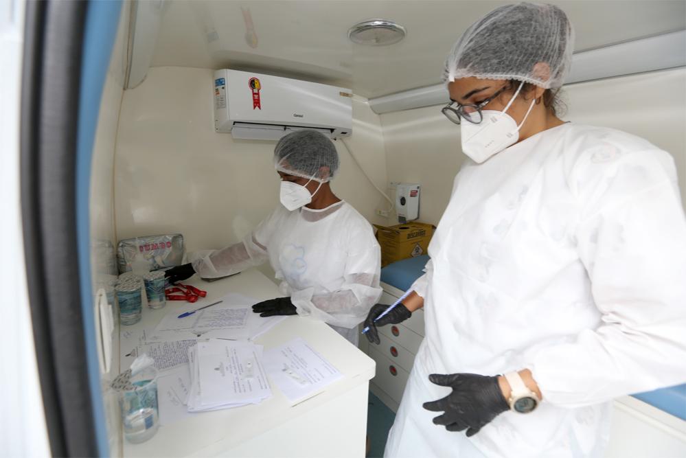 Já a testagem nos espaços públicos teve início no dia 24 de agosto e é feita por ordem de chegada com o apoio de 30 profissionais. O tipo de exame realizado é o teste rápido, visando pesquisa de anticorpos IGM e IGG. De acordo com a coordenadora, essa ação é realizada duas vezes por semana, sendo, em média, 500 testes realizados em pontos de grande circulação de pessoas e locais públicos. O resultado do teste rápido sai no mesmo dia, em média em 20 minutos, já os RT-PCR são encaminhados ao Lacen, onde é dada uma média de três a cinco dias para a liberação do resultado.