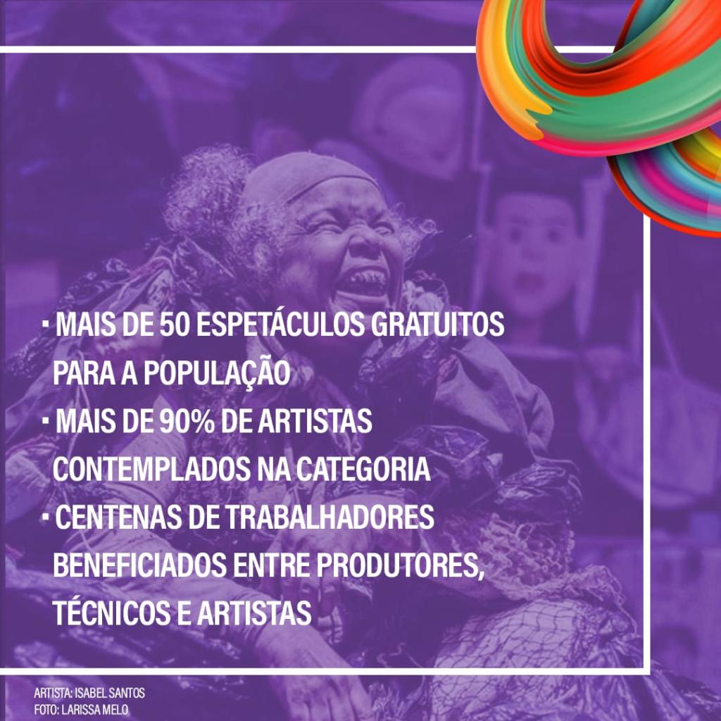 Serão mais de 600 mil reais destinados aos artistas contemplados na categoria Artes Cênicas, cerca de 56,25% a mais da verba prevista inicialmente. Este montante, contempla diversas etapas da cadeia produtiva entre artistas, produtores, técnicos e elenco através de espetáculos de teatro, dança, circo contemporâneo, circo tradicional, além de pesquisas, workshops e webinários, promovendo a manutenção de grupos artísticos além de estimular o debate sobre as Artes Cênicas, atingindo e beneficiando diretamente centenas de pessoas.