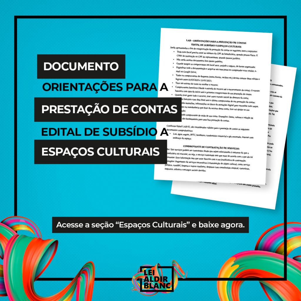 Para isso, a Funcaju disponibilizou, nesta terça-feira, 12, no site www.aldirblancaju.art.br, o arquivo “LAB – ORIENTAÇÕES PARA A PRESTAÇÃO DE CONTAS EDITAL DE SUBSÍDIOS A ESPAÇOS CULTURAIS”, no qual constam as devidas orientações e documentos específicos para a efetivação da prestação de contas.
