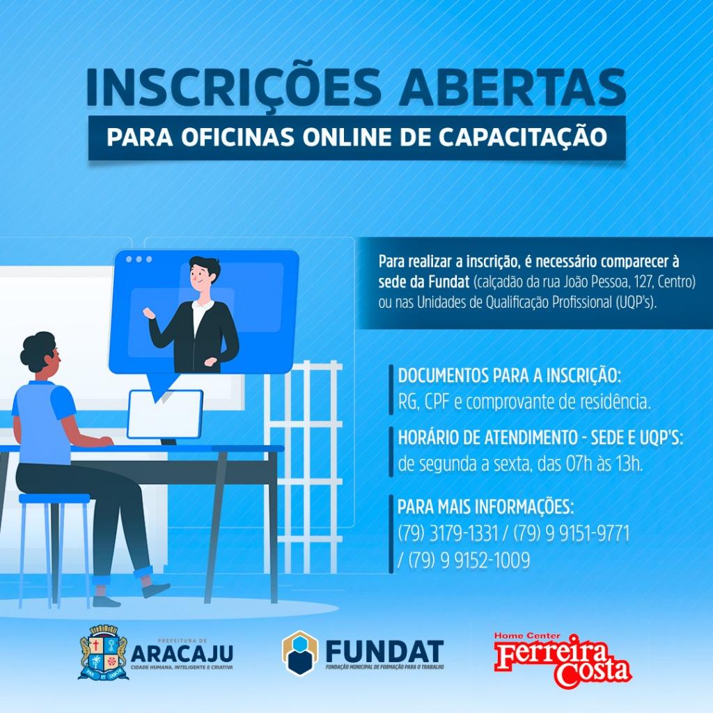 A partir desta quarta, 13, a Prefeitura de Aracaju, por meio de parceria firmada entre a Fundação Municipal de Formação para o Trabalho (Fundat) e a empresa Ferreira Costa, abre inscrições para três oficinas online de capacitação.