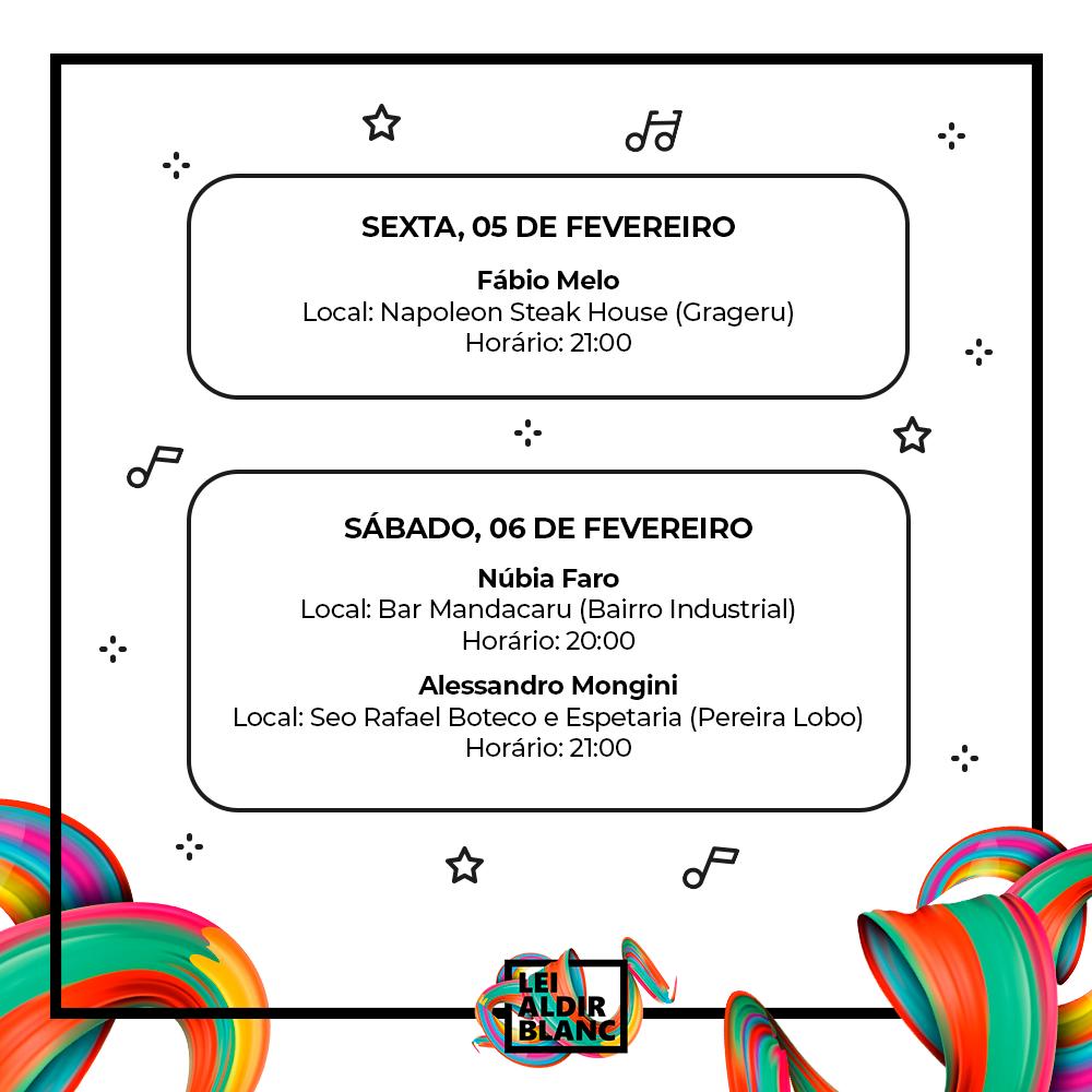 A programação musical continua no sábado, dia 6. Núbia Faro fará seu baile no Bar Mandacaru, no Bairro Industrial, às 20h. O estabelecimento está localizado na rua São João, 331, Bairro Industrial. Na mesma noite, no Seo Rafael Boteco e Espetaria, o músico Alessandro Mongini apresentará o seu repertório de MPB. O boteco fica localizado na Rua Rafael de Aguiar, 561, no Pereira Lobo, e o show terá início às 21h.