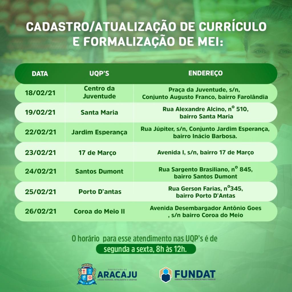 Nos bairros, a Fundat realiza busca ativa de comerciantes locais que ainda encontram-se na informalidade para estimular a formalização de novos microempreendedores individuais.Esse trabalho é desenvolvido, mensalmente, a partir de um cronograma específico para cada UQP, das 8h às 12h. Porém, para demais atendimentos, as UQPs funcionam de segunda a sexta, das 7h às 13h. O objetivo da Fundação é levar os serviços para mais perto dos aracajuanos, por meio das unidades instaladas em diversas regiões da cidade.